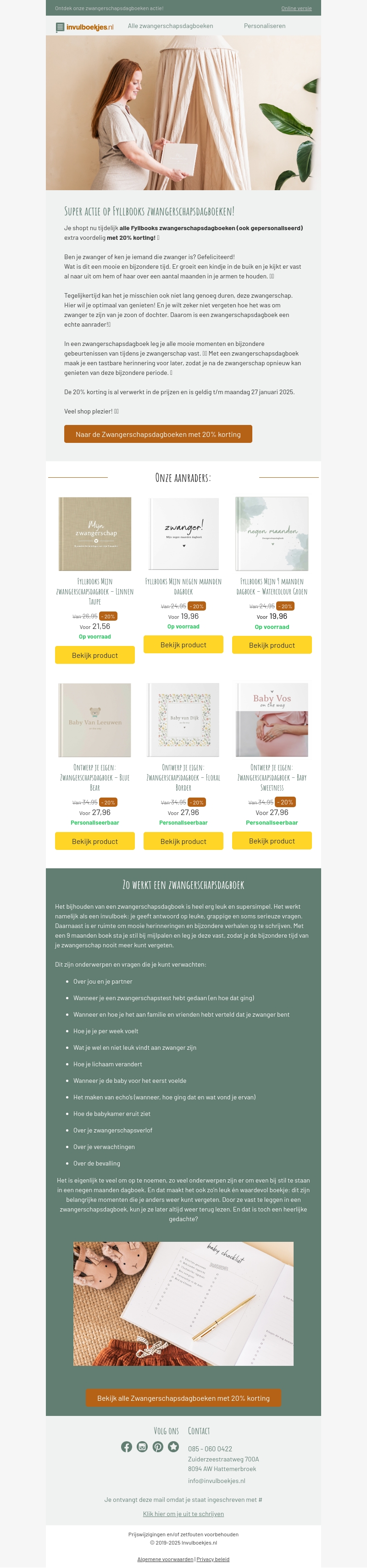 Mis geen enkel bijzonder moment van je zwangerschap. Invulboekjes.nl biedt nu prachtige zwangerschapsdagboeken aan met 20% korting. Kies uit gepersonaliseerde opties en leg waardevolle herinneringen vast. Deze korting is geldig tot en met 31 januari 2025, dus wees er snel bij. Ontdek hoe je je ervaringen kunt bijhouden en delen met dierbaren.