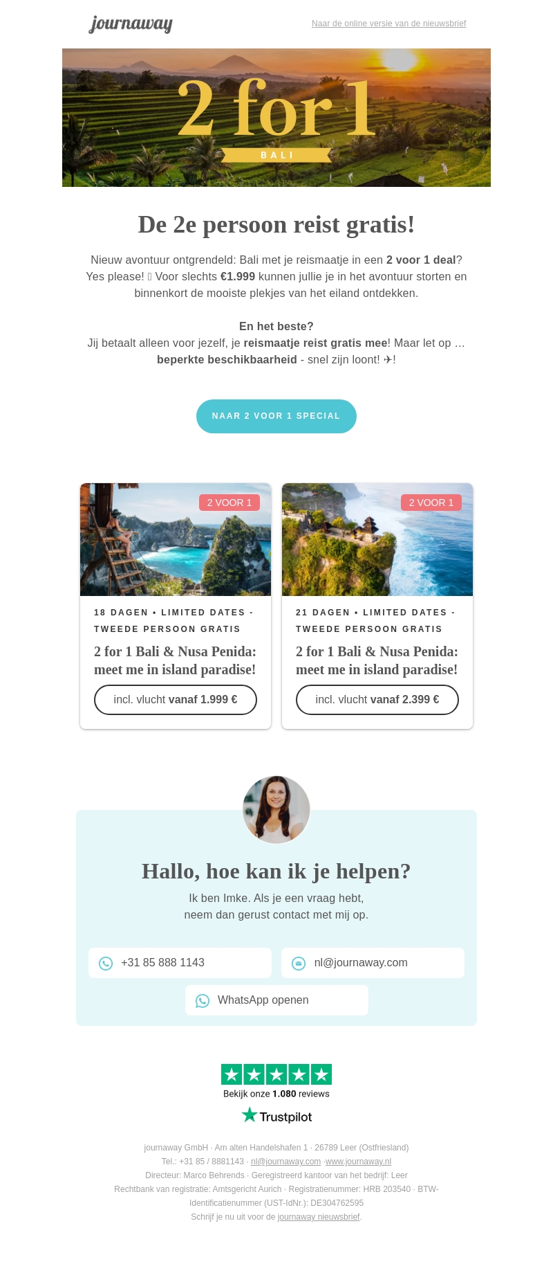 Ontdek Bali met onze speciale 2 voor 1 deal. Voor slechts €1.999 reis je samen naar de prachtige eilanden. De tweede persoon reist gratis! Grijp je kans, want beschikbaarheid is beperkt. Boek nu en beleef de schoonheid van Bali.