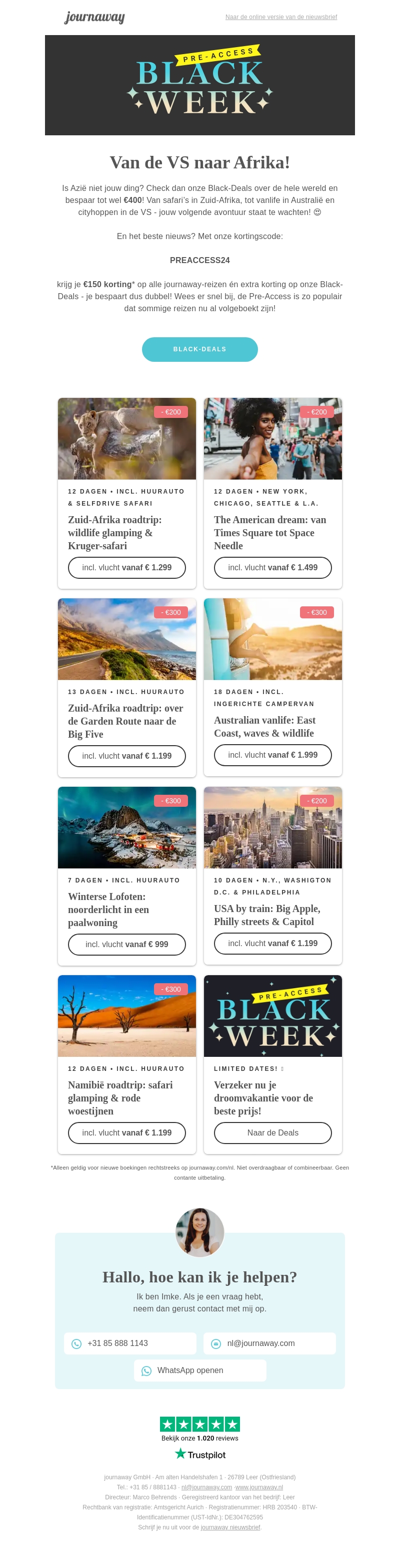 Reis de wereld rond met onze spannende Black Deals! Van safari's in Zuid-Afrika tot cityhops in de VS en van het ontdekken van de Australische oostkust tot de indrukwekkende Noorderlicht in Lofoten. Ontvang extra kortingen en boek je droomvakantie voor de beste prijs. Gebruik onze speciale kortingscode en bespaar nog meer.
