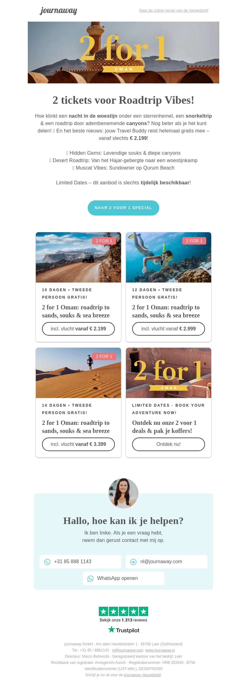 Beleef de magie van Oman met een exclusieve 2 voor 1 aanbieding. Verken adembenemende woestijnen, snorkel in kristalhelder water, en geniet van culturele ervaringen in levendige souks. Boek nu en ontdek het avontuur samen met je travel buddy, want hij/zij reist gratis mee! Let op, deze aanbieding is tijdelijk beschikbaar.