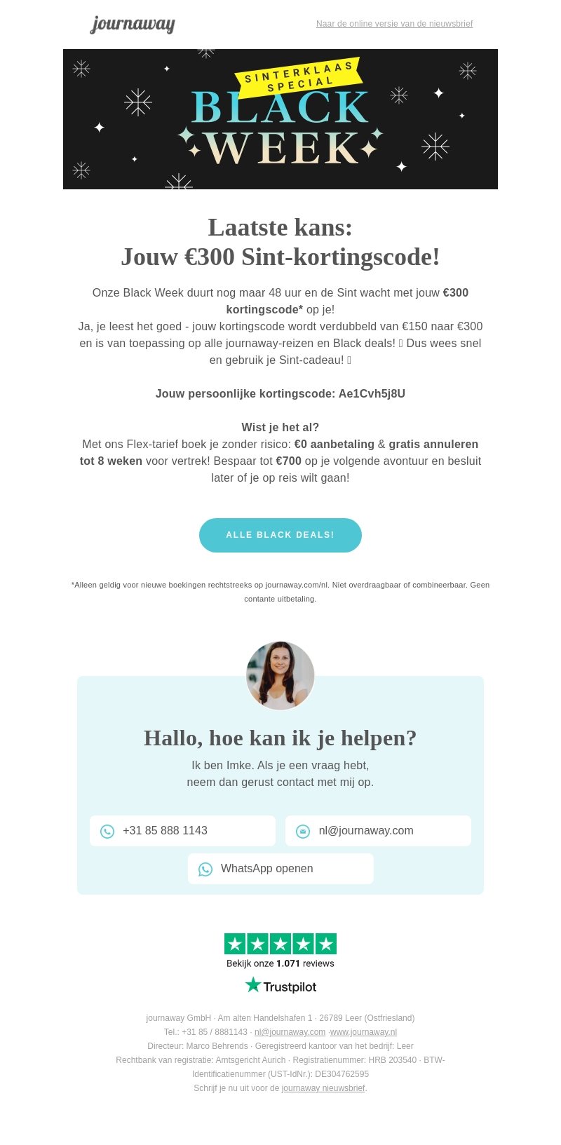 Onze Black Week actie biedt je maar liefst β¬300 korting op alle journaway-reizen. Geniet van verdubbelde kortingen en maak gebruik van deze speciale Sinterklaas-aanbieding. Reserveer zonder risico met onze flexibele tarieven. Deze actie is alleen beschikbaar voor een beperkte tijd dus wees er snel bij.