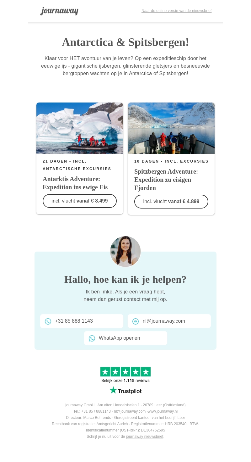 Beleef een onvergetelijke expeditie door het adembenemende landschap van Antarctica en Spitsbergen. Laat je meevoeren langs gigantische ijsbergen en glinsterende gletsjers. Boek nu je avontuur met vluchten inbegrepen vanaf € 4.899. Ontdek de pakkende reisprogramma's voor zowel 21 als 10 dagen, inclusief uitgebreide excursies.
