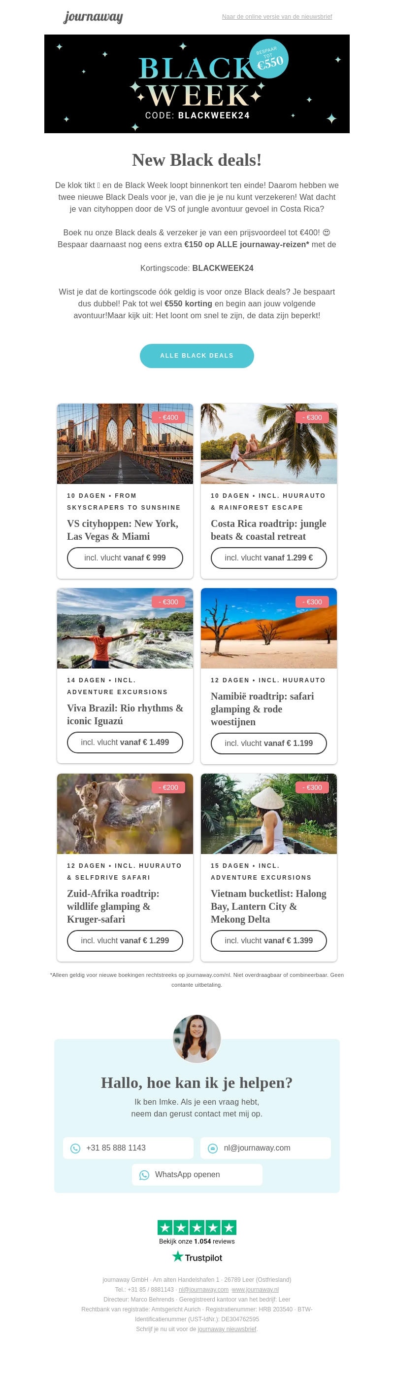 De Black Week aanbiedingen zijn hier! Verzeker je van geweldige reisdeals en bespaar tot €550 op je volgende avontuur. Of je nu wilt cityhoppen door de VS of de jungle van Costa Rica wilt verkennen, de kortingen zijn te mooi om te missen. Gebruik de code BLACKWEEK24 voor extra voordeel. Wees snel, want de deals zijn alleen geldig voor een beperkte tijd!