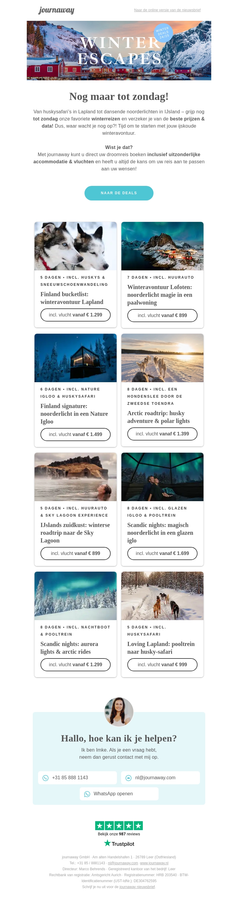 Grijp je kans om tot zondag een van de adembenemende winterreizen te boeken. Kies uit huskysafari's in Lapland of noorderlichtavonturen in IJsland. Profiteer van de beste prijzen en datums voor jouw ultieme winteravontuur. Boek bij journaway en geniet van uitzonderlijke accommodaties en vluchten. Wat houd je nog tegen?