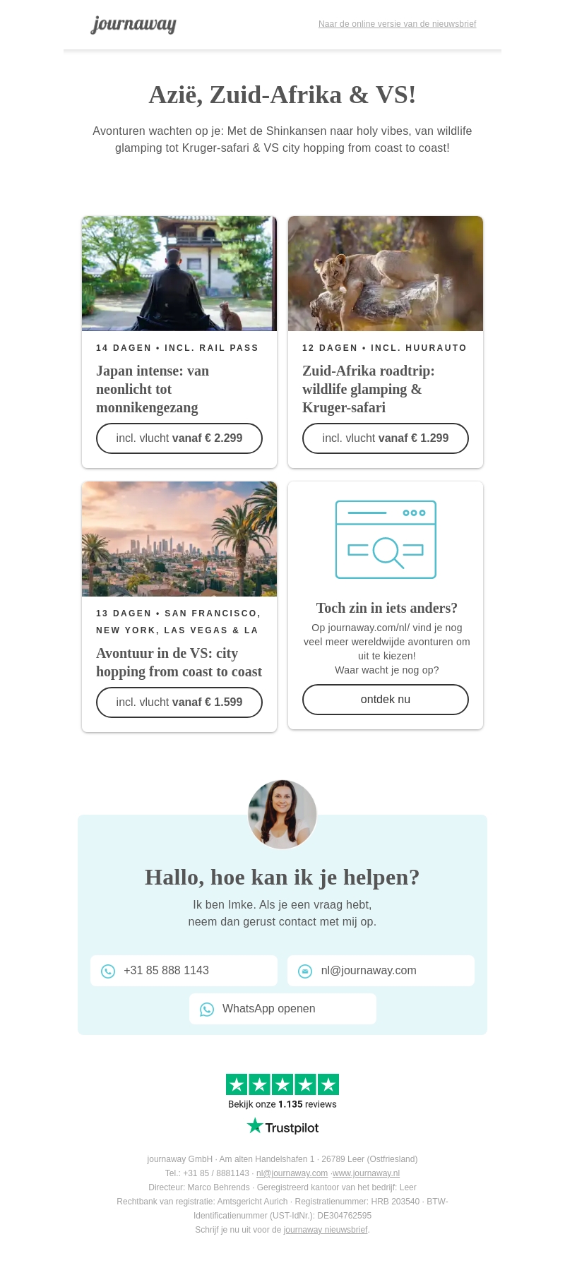 Beleef een onvergetelijk avontuur met onze reizen door Azië, Zuid-Afrika en de Verenigde Staten. Geniet van de Shinkansen in Japan, glamping en safari in Zuid-Afrika, of ervaar het stadsleven van de VS. Kies je ideale reis en start je avontuur vanaf € 1.299 per persoon. Boek nu en laat de wereld je inspireren!