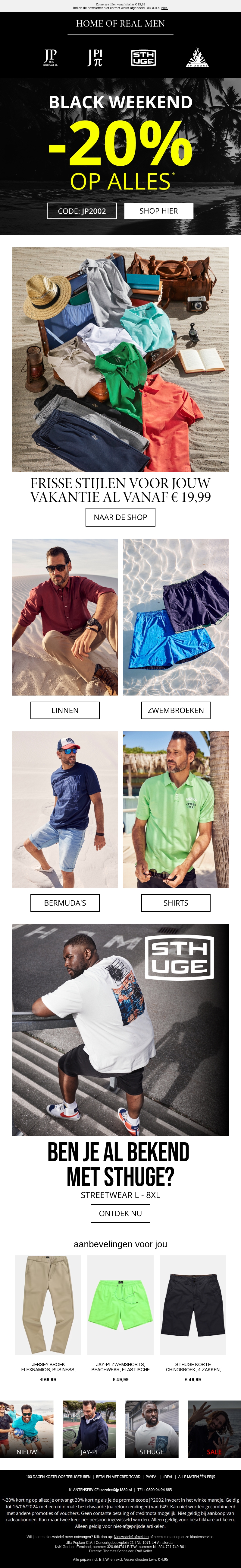 Ontdek de fantastische kortingen tijdens Black Weekend! Bespaar 20% op alles en trakteer jezelf op de nieuwste modetrends. Van linnen tot zwembroeken, er is voor ieder wat wils. Gebruik de code JP2002 bij het afrekenen. Wacht niet langer en vernieuw je garderobe nu!