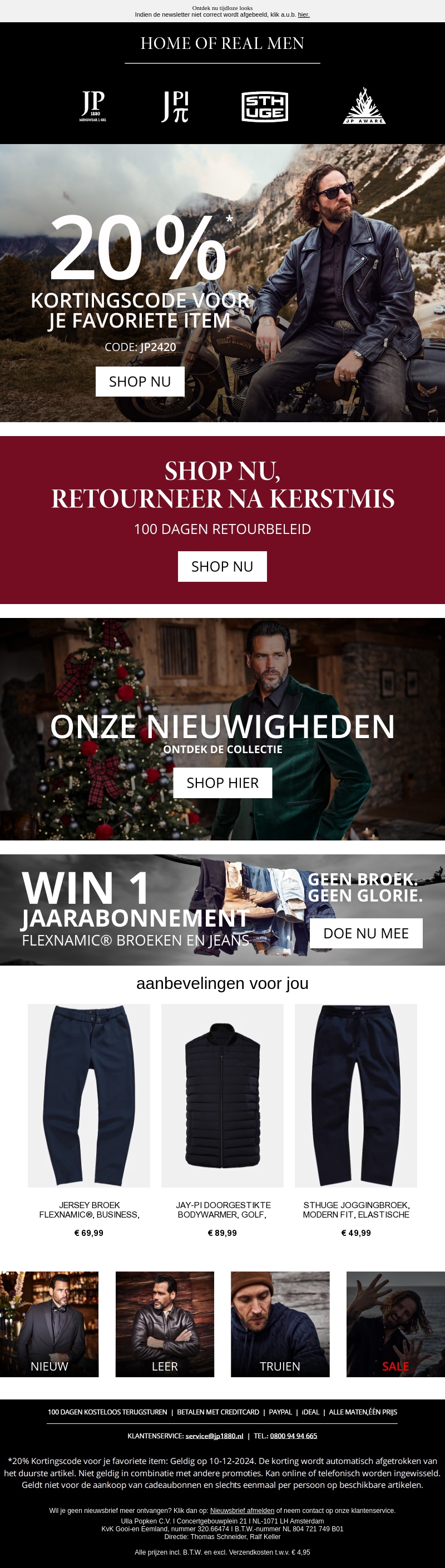 Profiteer van een exclusieve korting van 20% op een item naar keuze bij jouw favoriete merken. Met de kortingscode JP2420 krijg je de ideale deal, net op tijd voor de feestdagen. Bovendien biedt onze winkel een handige 100 dagen retourbeleid na Kerstmis. Ontdek onze nieuwste collecties en doe mee met onze winactie voor een jaarabonnement op Flexnamic® broeken en jeans. Kom snel langs en shop de beste aanbiedingen.