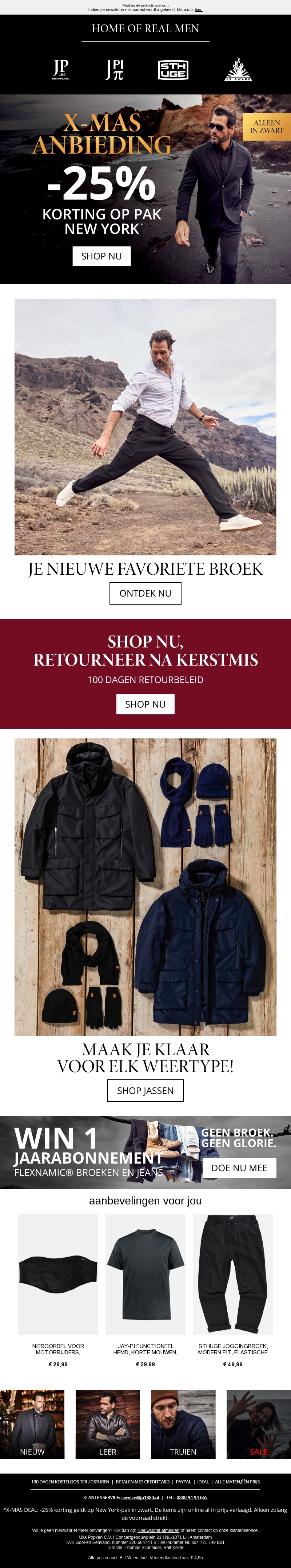 Profiteer van 25% korting op het New York-pak en upgrade jouw garderobe voor de feestdagen. Deze exclusieve aanbieding geldt alleen voor aankopen in zwart. Ontdek bovendien je nieuwe favoriete broek en shop met een gerust hart, want retourneren kan tot na Kerstmis. Bereid je voor op alle weersomstandigheden met onze geselecteerde jassen. Doe mee aan onze winactie en maak kans op een jaarabonnement.