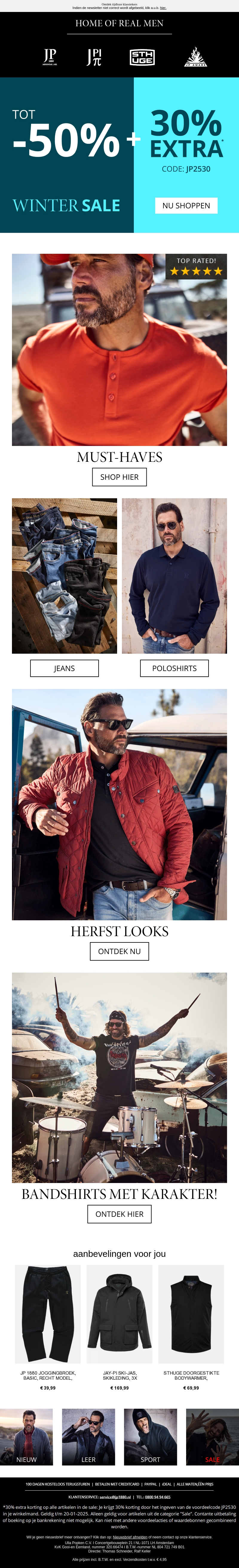 Geniet van geweldige kortingen tot 50% op onze winter SALE items. Ontvang bovendien een extra 30% korting met de speciale code JP2530. Verken onze must-have jeans en poloshirts, plus unieke bandshirts. Mis deze kans niet om je garderobe te vernieuwen.