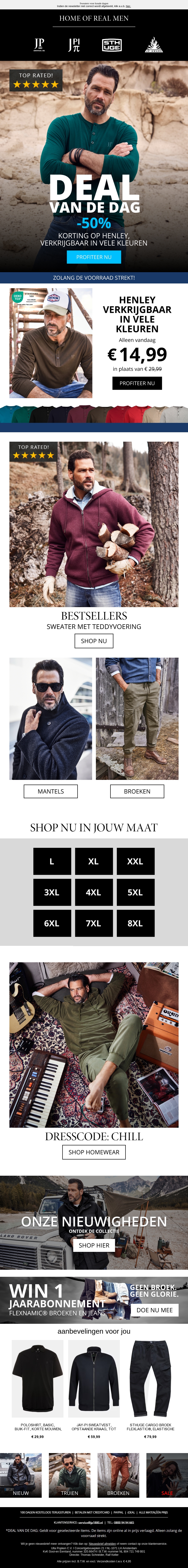 Profiteer nu van de deal van de dag met 50% korting op Henley shirts, verkrijgbaar in verschillende kleuren. Dit is je laatste kans om stijlvolle en comfortabele shirts tegen een scherpe prijs te bemachtigen. Daarnaast zijn er ook andere bestsellers zoals truien en mantels in voorraad. Shop meteen in jouw maat, variërend van L tot 8XL. Ontdek ook onze nieuwste collectie voor een frisse look deze winter.