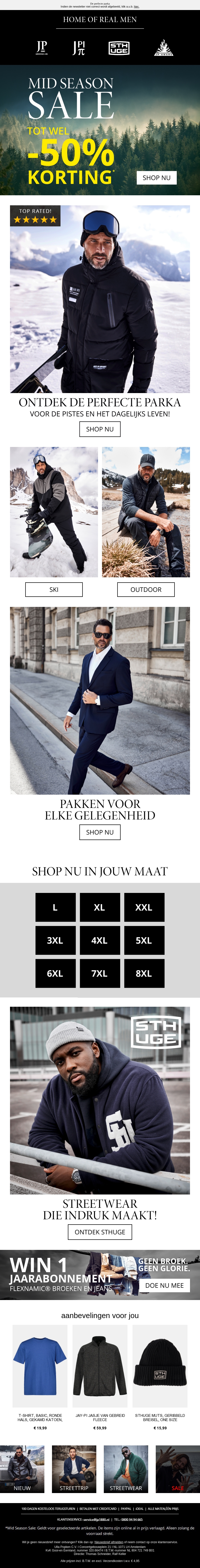 De Midseason Sale is hier met spectaculaire kortingen tot wel 50%. Ontdek de nieuwste stijlen voor elke gelegenheid, van stijlvolle parkaβs voor de winterse pistes tot verfijnde pakken voor zakelijke meetings. Vergeet niet de indrukwekkende streetwear collectie te bekijken. Vind jouw perfecte outfit in onze uitgebreide maatrange, van L tot 8XL. Profiteer nu van ongekende aanbiedingen en vul je garderobe aan.