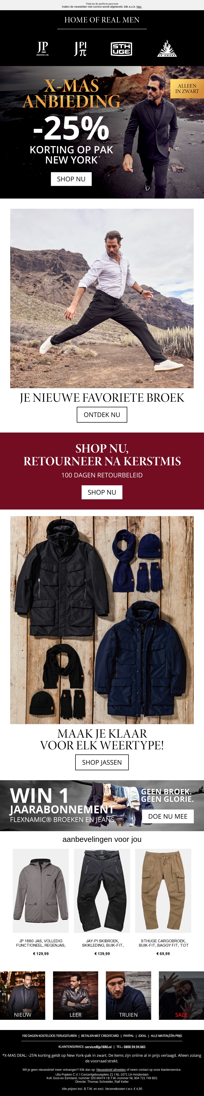 Ontdek onze exclusieve kerstaanbieding met 25% korting op het stijlvolle New York-pak, perfect voor het winterseizoen. Profiteer van deze beperkte tijdsaanbieding. Gratis retourneren mogelijk na Kerstmis met ons 100 dagen retourbeleid. Vind ook je nieuwe favoriete broek en jassen voor elk weertype. Doe mee en maak kans op een jaarabonnement. Shop nu!