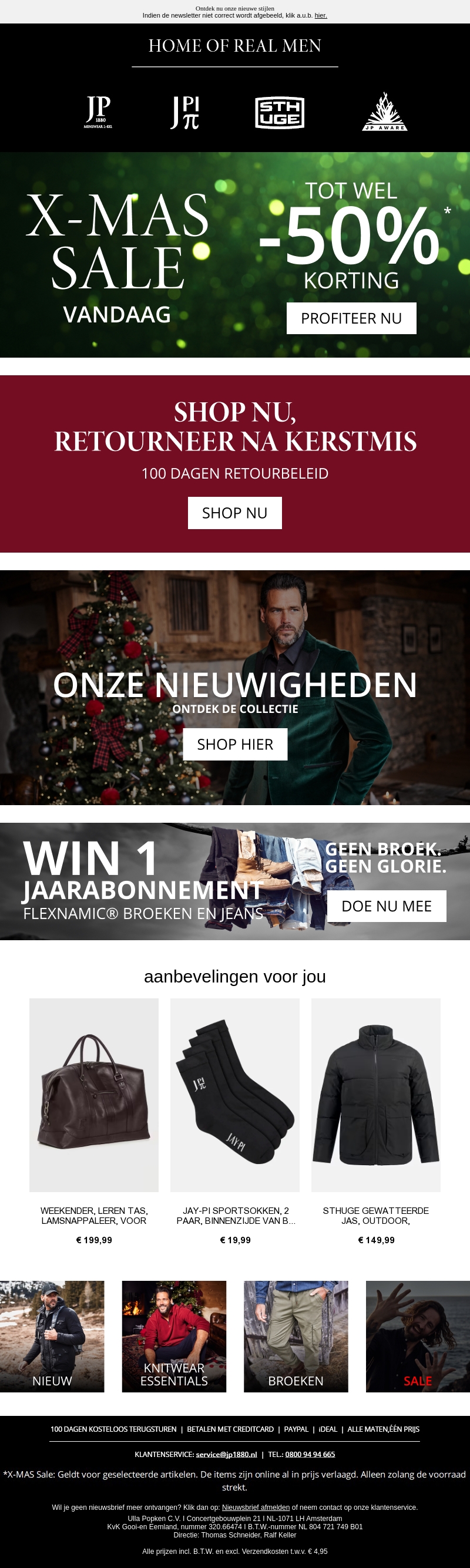 Beleef een feestelijke winkelervaring met onze X-MAS Sale en ontvang tot wel 50% korting op geselecteerde artikelen. Winkel nu en geniet van ons 100 dagen retourbeleid, zodat u zonder zorgen kunt beslissen. Mis onze nieuwste collecties niet en maak kans op een jaarabonnement bij aankoop van flexnamic® broeken en jeans.