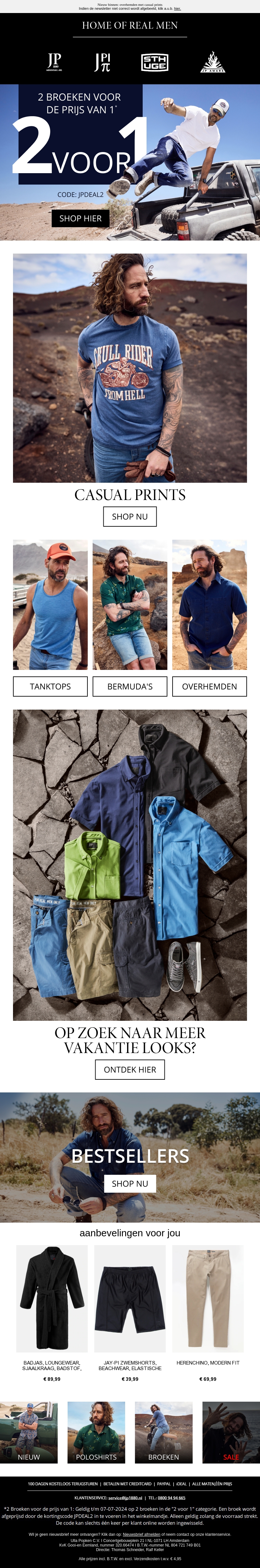 Profiteer nu van onze speciale aanbieding: 2 broeken voor de prijs van 1! Gebruik de code JPDEAL2 bij het afrekenen. Bekijk ook onze nieuwste collecties casual prints, tanktops, bermuda's en overhemden voor de zomer. Shop nu jouw favoriete items en ontdek meer vakantielooks.