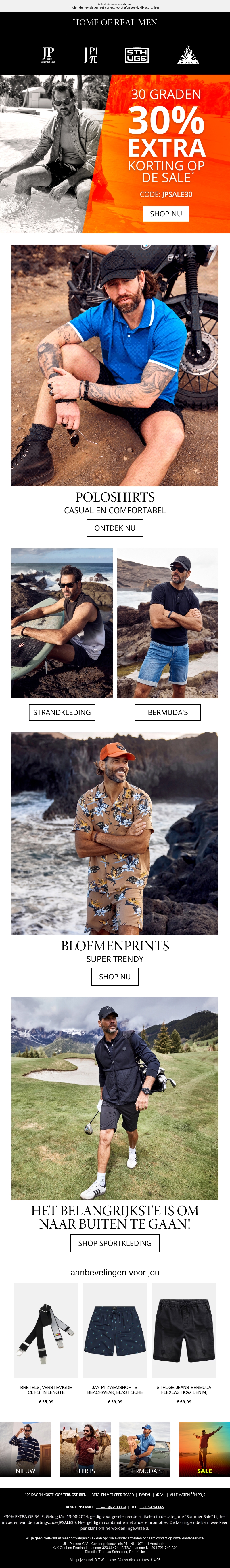 Krijg nu 30% extra korting op alle sale-artikelen bij Home of Real Men. Ontdek onze collectie poloshirts, strandkleding, bermuda's, en trendy bloemenprints. Mis het niet en gebruik de kortingscode JPSALE30 bij het afrekenen.