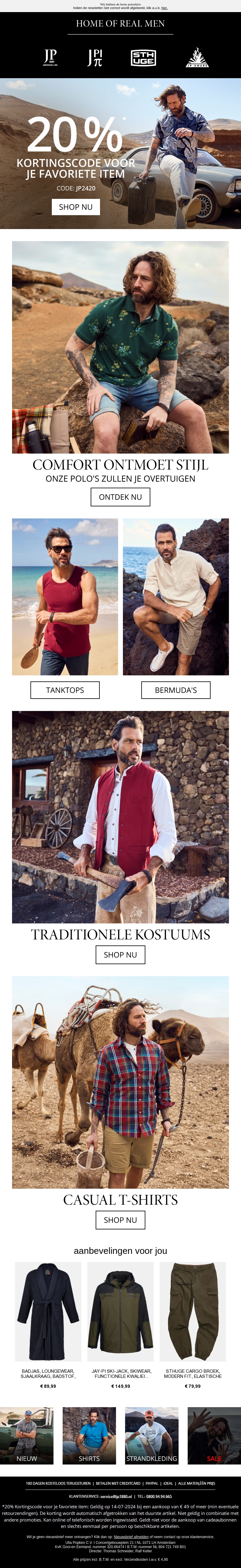 Mis het niet! Vandaag krijg je 20% korting op een item naar keuze met de kortingscode JP2/420. Kies uit een breed assortiment zoals comfortabele polo's, casual T-shirts en traditionele kostuums. Winkel nu en ontdek geweldige deals.