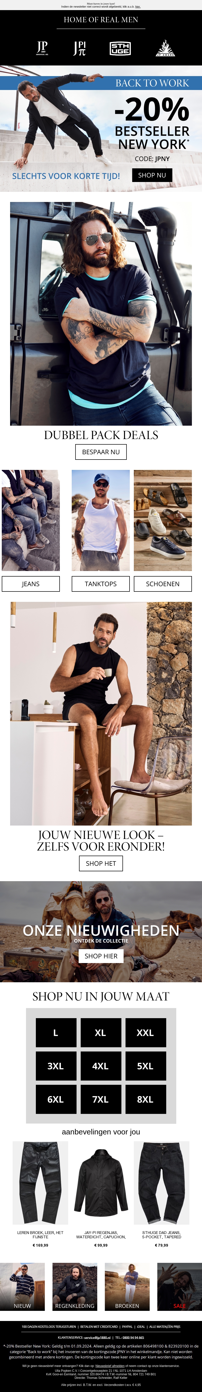Mis deze exclusieve aanbieding niet! Ontvang alleen vandaag 20% korting op ons bestseller New York-pak. Shop de nieuwste outfits en accessoires tegen gereduceerde prijzen. Profiteer nu van deze unieke kans en vernieuw je garderobe met trendy items.