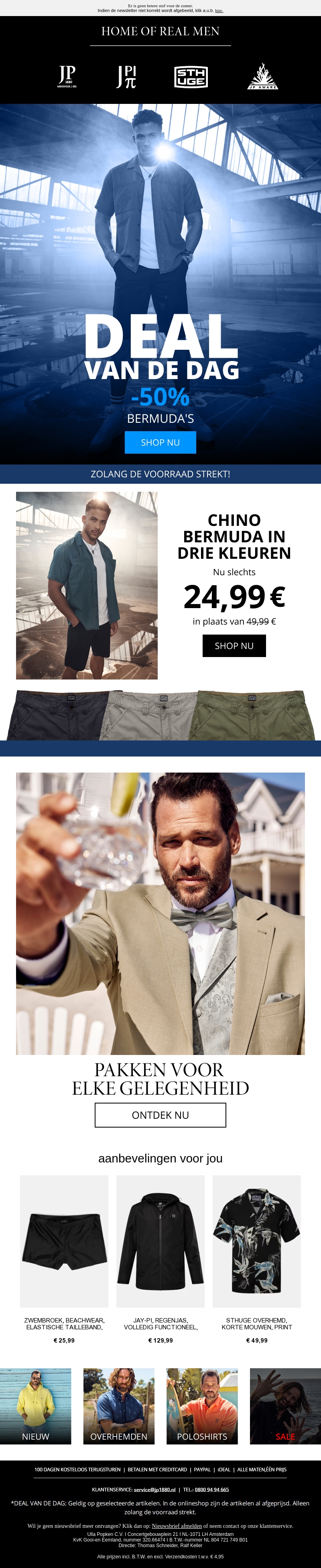 Mis deze geweldige deal van de dag niet! Bermuda shorts in drie kleuren voor slechts €24,99 in plaats van €49,99. Shop nu bij Home of Real Men zolang de voorraad strekt. Bekijk ook onze pakken voor elke gelegenheid.