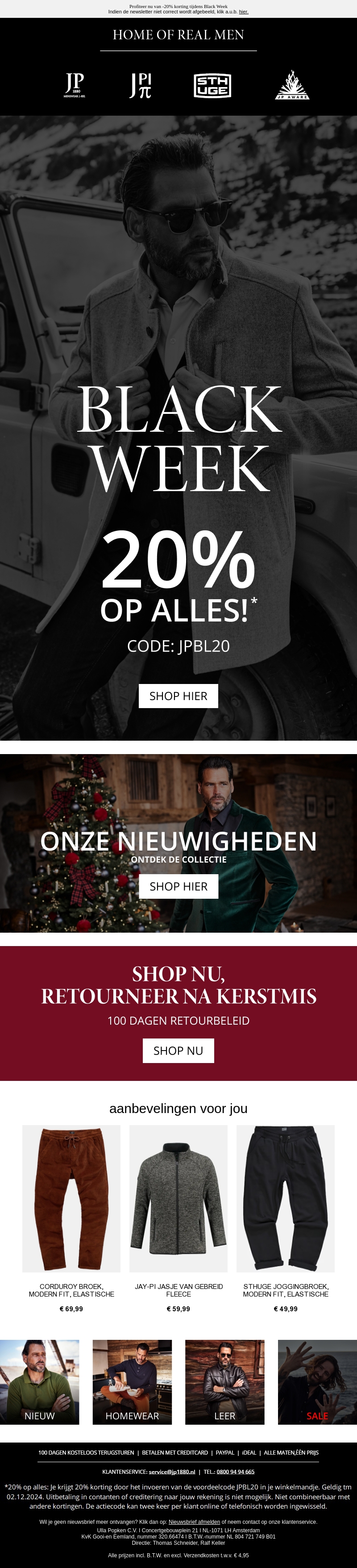 Black Week is aangebroken met een spectaculaire korting van 20% op alles in de winkel. Met de code JPBL20 geniet je van geweldige aanbiedingen. Ontdek onze nieuwste collectie en winkel met vertrouwen dankzij ons 100 dagen retourbeleid. Mis deze kans niet om je garderobe te vernieuwen met topkleding. Bezoek nu onze website en shop de beste deals. De actie loopt tot en met 2 december 2024.