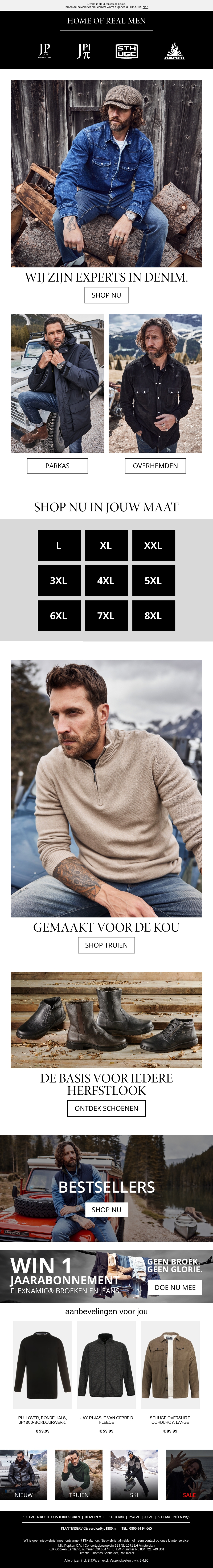 Maak kennis met onze nieuwste denim collectie voor echte mannen. Of je nu op zoek bent naar een stoer jasje, een comfortabele trui, of stevige schoenen; wij hebben het allemaal. Shop jouw favoriete items in maat L tot en met 8XL. Vergeet niet deel te nemen aan onze winactie voor een jaarabonnement.