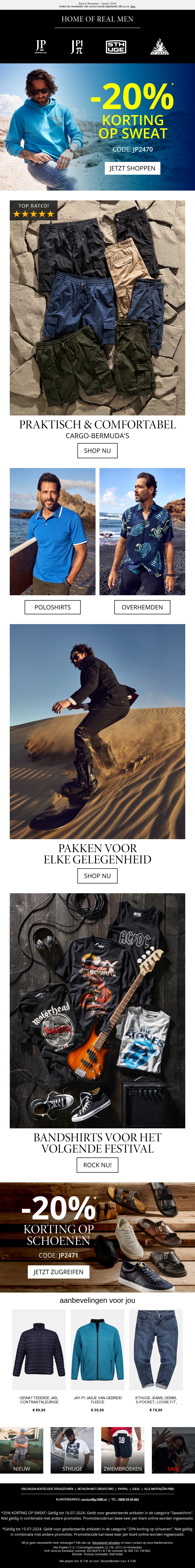 Met minder zomers weer in aantocht, is het tijd om te profiteren van 20% korting op sweat kleding. Deze nieuwsbrief toont top-rated cargo-bermuda's, poloshirts, overhemden en zelfs festivalbandshirts. Vergeet niet ook de 20% korting op schoenen! Shop nu en blijf stijlvol en comfortabel.