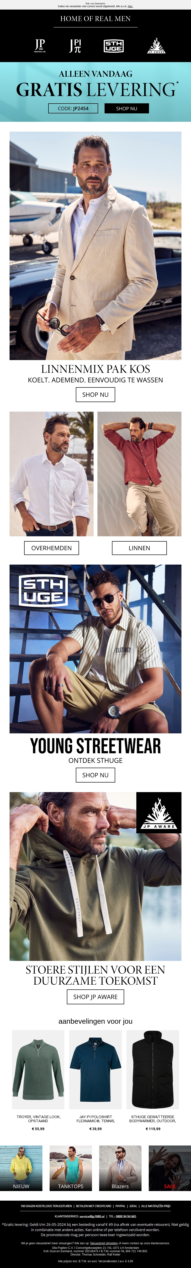 Profiteer van gratis levering op al je aankopen. Verken onze nieuwste collecties, waaronder stijlvolle linnenmix pakken, trendy overhemden, en duurzame streetwear. Mis deze exclusieve aanbiedingen niet.