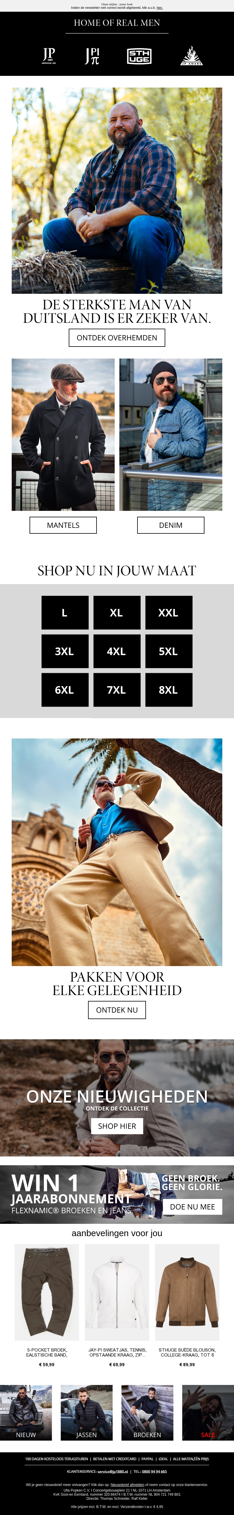 Verken een wereld van herenkleding met onze nieuwste collectie. Ontdek stijlvolle mantels en denim, perfect voor elke gelegenheid. Kies uit een breed scala van maten, van L tot 8XL. Onze producten zijn ontworpen voor comfort en stijl. Mis onze exclusieve aanbiedingen niet en blijf altijd in de mode. Doe mee en win een jaarabonnement!
