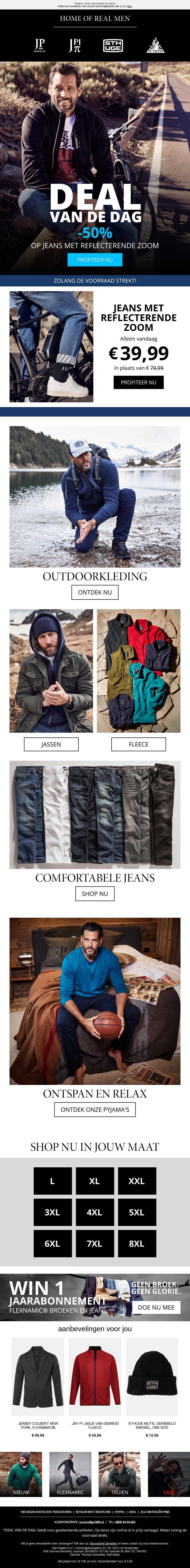 Profiteer van de deal van de dag: jeans met reflecterende zoom voor slechts €39,99. Stijlvolle en comfortabele spijkerbroeken, perfect voor elk avontuur. Bovendien hebben we een breed scala aan outdoorkleding en comfortabele pyjama's. Ontdek onze collectie en shop direct in jouw maat. Mis deze kans niet!