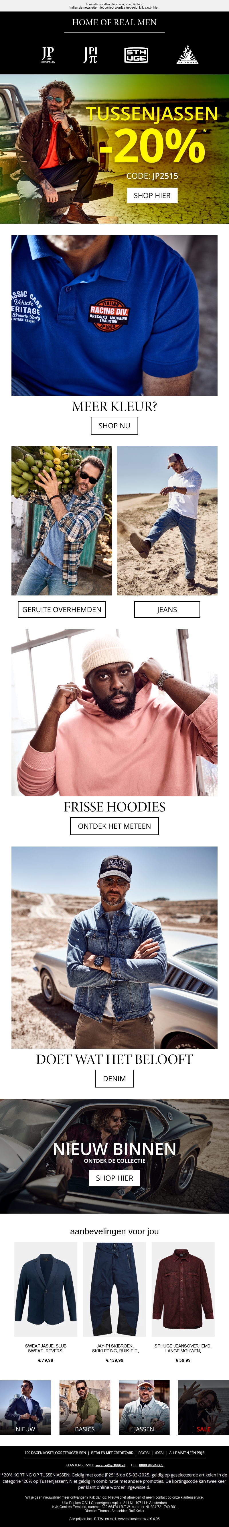 Bereid je voor op de lente met stijlvolle tussenjassen en ontvang 20% korting. Verken onze nieuwste collectie, van kleurrijke shirts tot frisse hoodies. Mis de kans niet om je garderobe te vernieuwen met onze exclusieve aanbiedingen. Gebruik de code JP2515 voor extra voordeel.