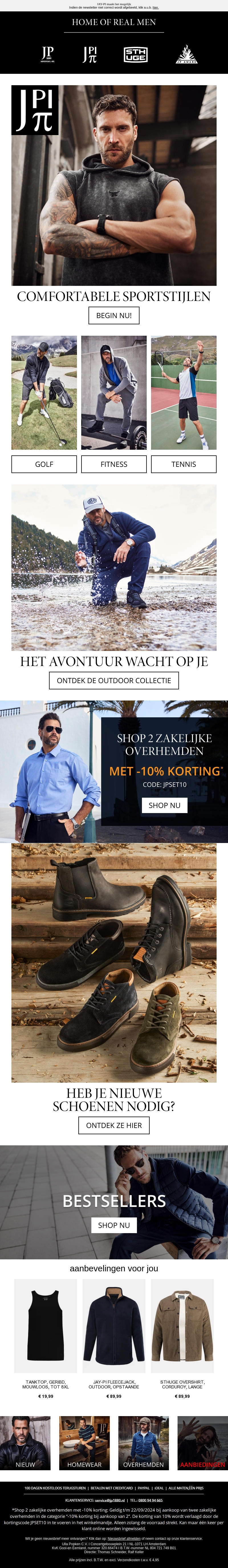 Deze nieuwsbrief presenteert JP, Pi en Stijl's nieuwste comfortabele sportkleding en outdoor collecties. Ontdek de perfecte outfit voor golf, fitness, tennis en meer. Inclusief aanbiedingen zoals 10% korting op overhemden. Shop nu voor de bestsellers!