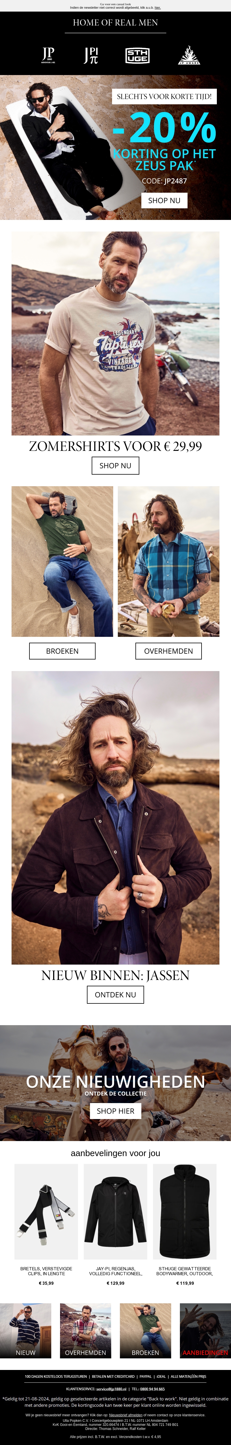 Ontvang nu 20% korting op ons topverkopende Zeus-pak. Daarnaast hebben we zomershirts vanaf €29,99 en een nieuwe collectie jassen beschikbaar. Mis het niet en shop nu!