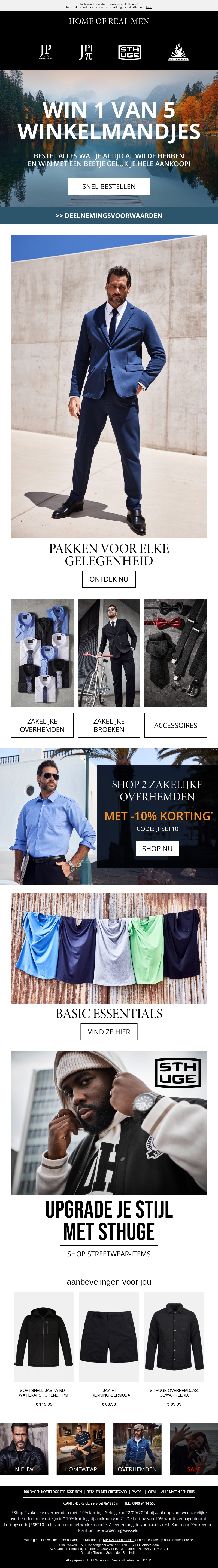 Grijp jouw laatste kans om je aankoopbedrag terug te winnen! Bestel alles wat je al wilde hebben en maak kans om één van de vijf winkelmandjes te winnen. Ontdek ook onze stijlvolle pakken, zakelijke overhemden, en accessoires met aantrekkelijke kortingen. Upgrade je stijl met onze nieuwe streetwear collectie van STHUGE.