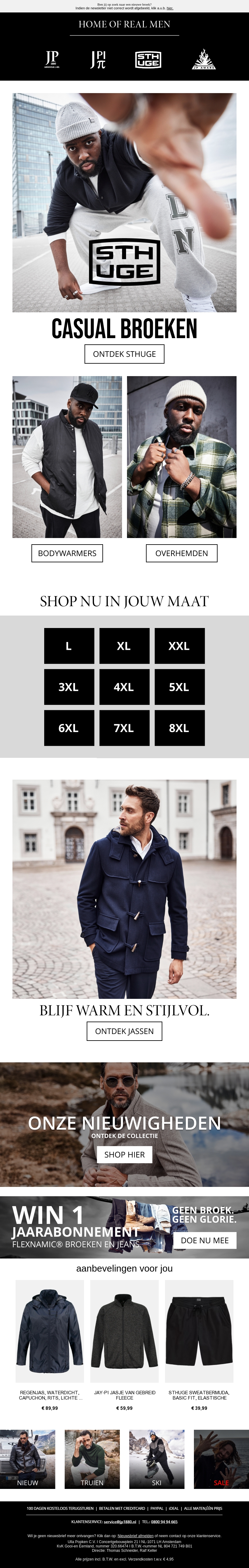 Ontdek de nieuwste collectie broeken van STHUGE die comfort en stijl combineren. Beschikbaar in een breed scala aan maten, van L tot 8XL, is er voor iedereen een perfecte pasvorm. De collectie biedt niet alleen broeken, maar ook bodywarmers en overhemden voor een volledige look. Blijf warm en stijlvol met onze selectie jassen. Doe mee met onze winactie en maak kans op een jaarabonnement. Shop nu en vernieuw je garderobe vandaag nog!