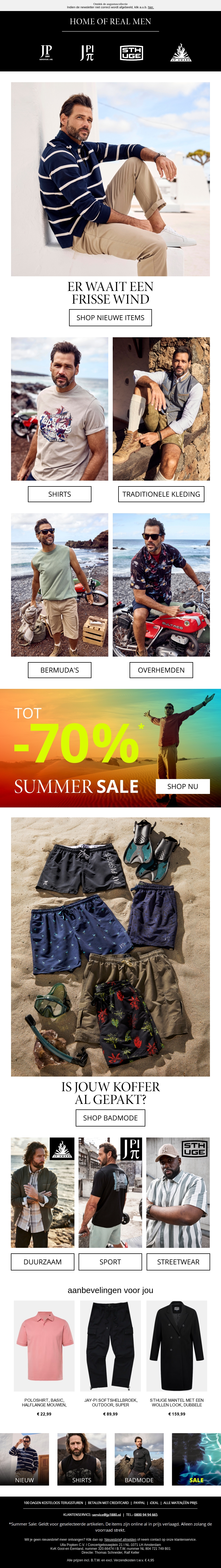 Ontdek de nieuwste mode met een frisse wind in je garderobe. Shop nu shirts, traditionele kleding, bermuda's en overhemden met exclusieve kortingen tot wel 70%! Zorg ervoor dat je klaar bent voor de zomer met onze badmode collecties en duurzame keuzes.