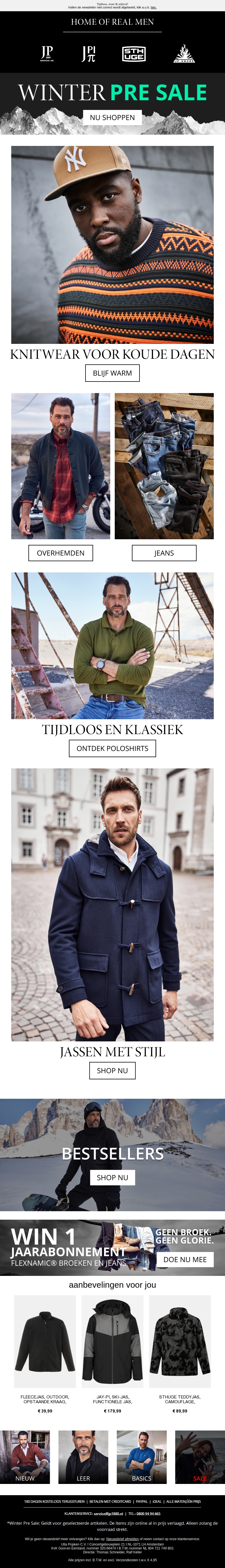 Bereid je voor op de winter met onze exclusieve Pre-Sale. Ontdek warme knitwear, klassieke overhemden, tijdloze poloshirts, en stijlvolle jassen. Mis de kans niet om je garderobe aan te vullen met onze bestsellers. Neem deel aan de winactie voor een jaarabonnement op flexmatic broeken en jeans.