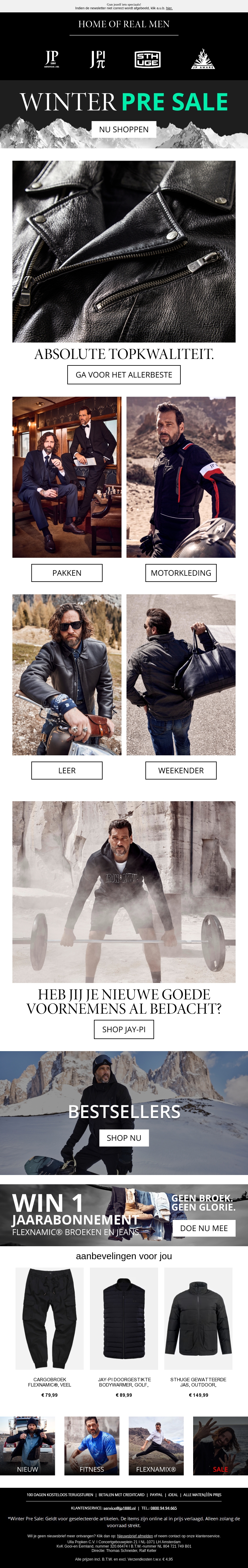 Verwen jezelf met onze Winter Pre-Sale, waarin we topkwaliteit herenkleding aanbieden. Ontdek stijlen zoals pakken, motorkleding, leer en meer. Perfect voor wie op zoek is naar de beste winterstijl. Of je nu op de motor stapt of naar kantoor gaat, wij bieden het allemaal. Bezoek ons nu en geniet van de beste deals voor het seizoen.