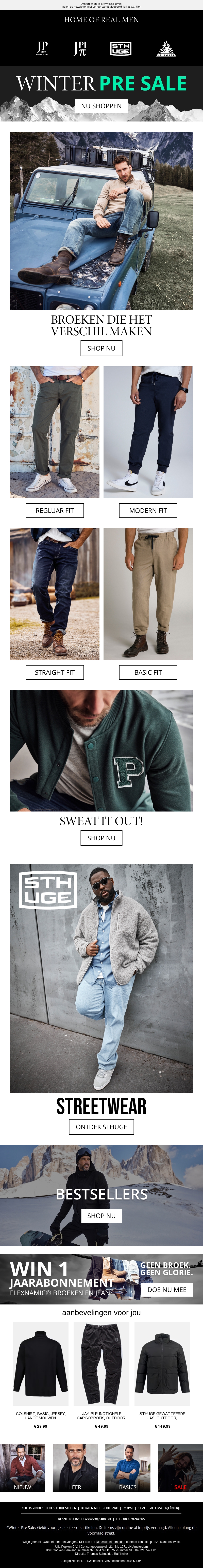 De Winter Pre-Sale is begonnen! Vind de perfecte broeken in verschillende stijlen zoals regular, modern, straight en basic fit. Daarnaast zijn er trendy sweatwear en streetwear beschikbaar. Ontdek onze bestsellers en maak kans op een jaarabonnement met exclusieve aanbiedingen. Wees er snel bij en shop nu de nieuwste mode.