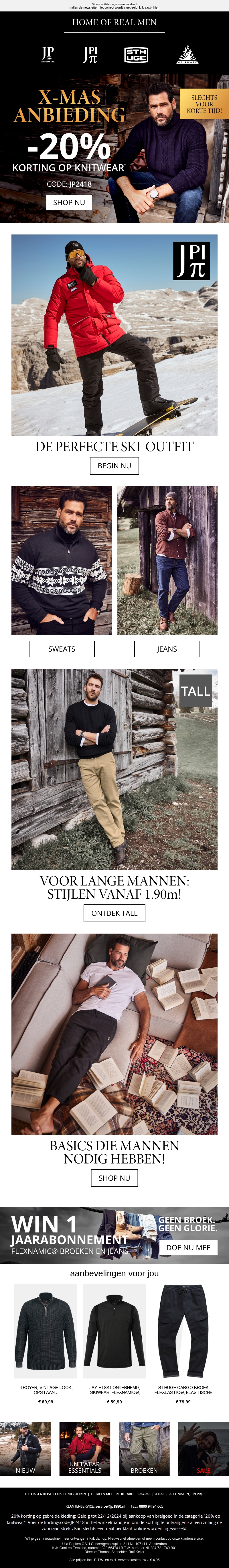 Mis deze geweldige kans niet om te profiteren van 20% korting op onze stijlvolle knitwear. Perfect voor de wintermaanden en ski-uitjes. Bezoek ons assortiment sweatshirts en jeans voor lange mannen en ontdek comfortabele basics die elke man nodig heeft. Doe mee aan onze winactie voor een kans op een jaarabonnement op jeans.