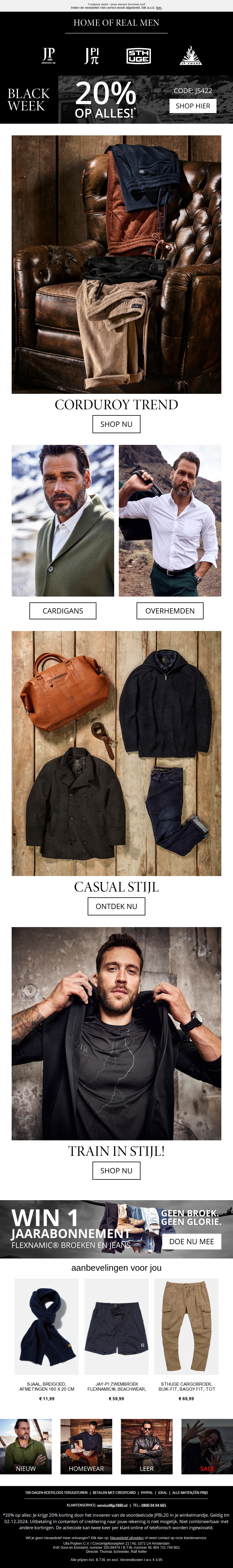 Geniet van 20% korting tijdens Black Week bij Home of Real Men. Verken de nieuwste trends, zoals corduroy en casual stijl. Mis niet de kans om een jaarabonnement te winnen op flexibele broeken en jeans. Shop nu en profiteer van de aantrekkelijke aanbiedingen.