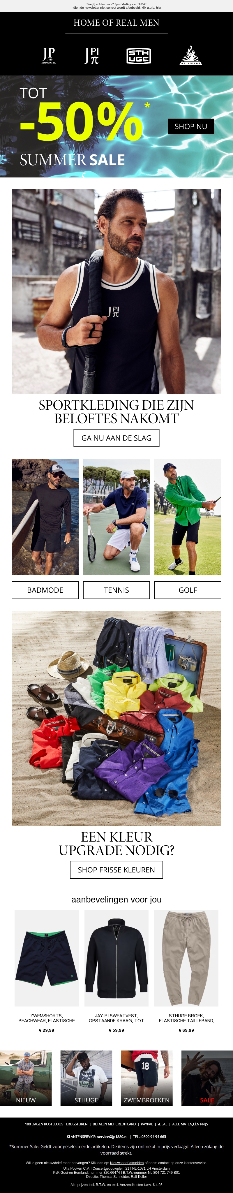 Trakteer jezelf op geweldige kortingen tot wel 50% tijdens de Summer Sale bij 'Home of Real Men'. Verwen jezelf met sportkleding die beloftes nakomt. Ontdek onze collectie in badmode, tennis, golf en nog veel meer. Toon je stijl met een kleurupgrade! Shop nu en upgrade je garderobe met deze hete deals.