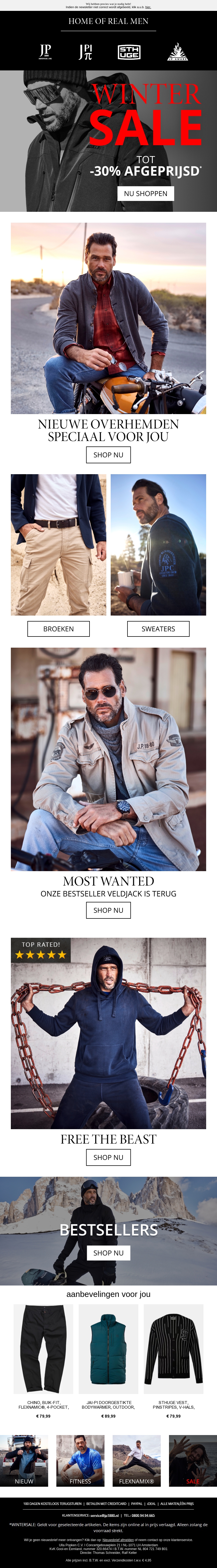 De winter is hier en dat betekent tijd voor grote besparingen! Profiteer van kortingen tot -30% op een breed scala aan stijlvolle herenkleding. Ontdek nu onze collectie jassen, truien, broeken en meer. Mis deze kans niet om je garderobe tegen een gereduceerde prijs te vernieuwen. Koop snel in om van de beste deals te profiteren.