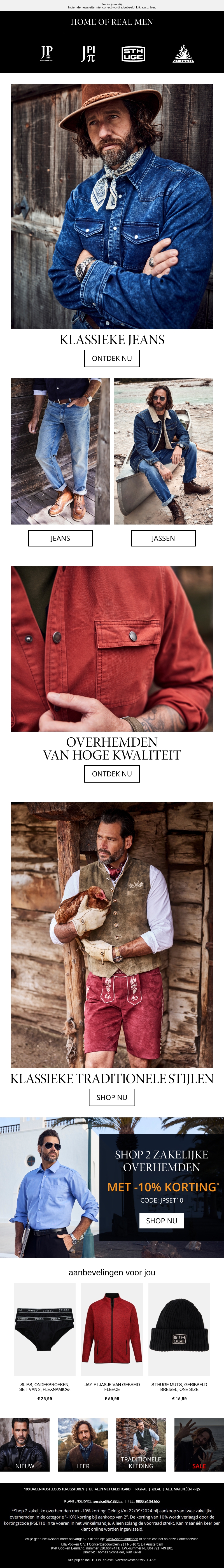 Maak kennis met onze nieuwste collectie stoere denims die gegarandeerd opvallen. Van klassieke jeans en jassen tot hoogwaardige overhemden, wij bieden stijlvolle kleding voor elke man. Ontdek ook onze traditionele stijlen en profiteer van -10% korting met code JP5E10. Mis het niet!