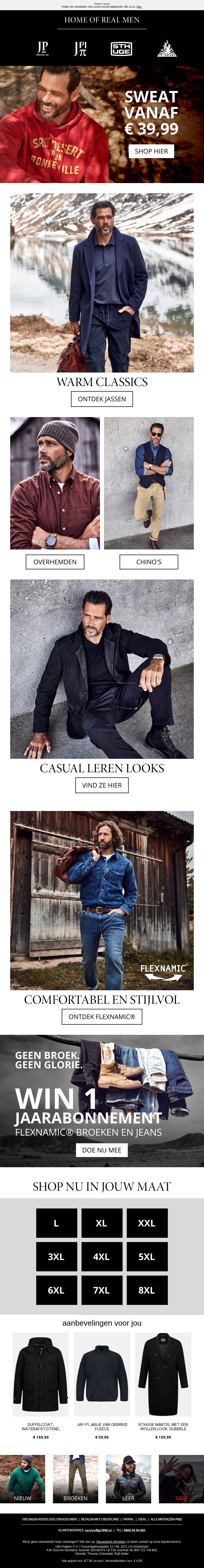 Bereid je voor op de herfst met onze collectie van sweatshirts vanaf € 39,99. Verken warme klassiekers, zoals jassen en casual leren looks. Ontdek de veelzijdigheid van onze chino's en overhemden. Flexibel en stijlvol, onze kledingstukken bieden comfort en elegantie voor elk moment. Vergeet niet mee te doen aan onze actie om een jaarabonnement te winnen!