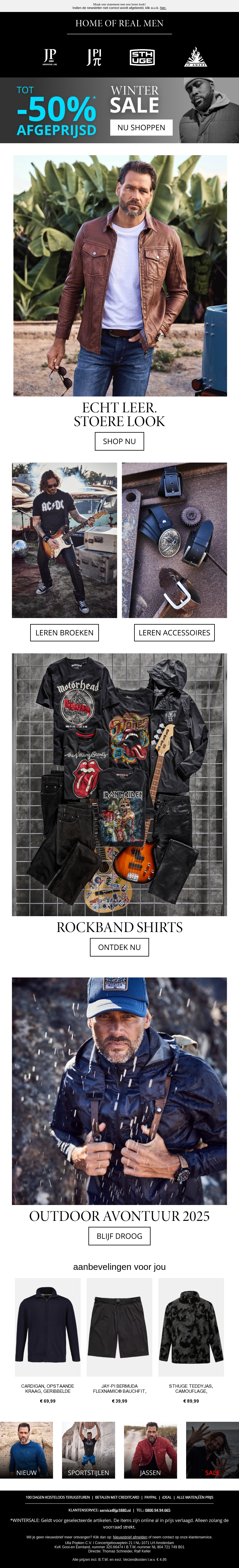Ontdek de nieuwste collectie voor mannen met kortingen tot 50%. Van leren jassen tot rockband shirts, er is voor ieder wat wils. Bereid je voor op de kou met stoere en stijlvolle kleding. Shop nu de beste deals voor het winterseizoen. Bescherm jezelf tegen de elementen en zie er geweldig uit. Mis deze winter sale niet!