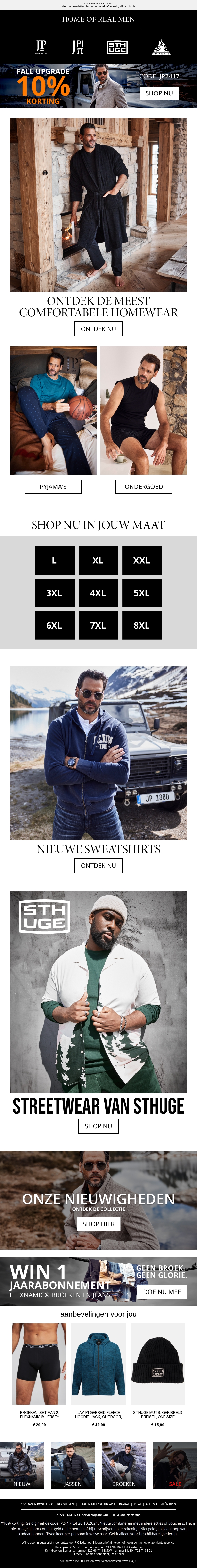 Grijp nu je kans om de meest comfortabele herfstkleding te scoren met 10% korting. Ontdek de nieuwste collecties van truien, pyjama’s en ondergoed. Voor elke maat is er een perfect kledingstuk te vinden. Profiteer ook van streetwear van hoge kwaliteit. Deze actie is tijdelijk, dus shop snel!