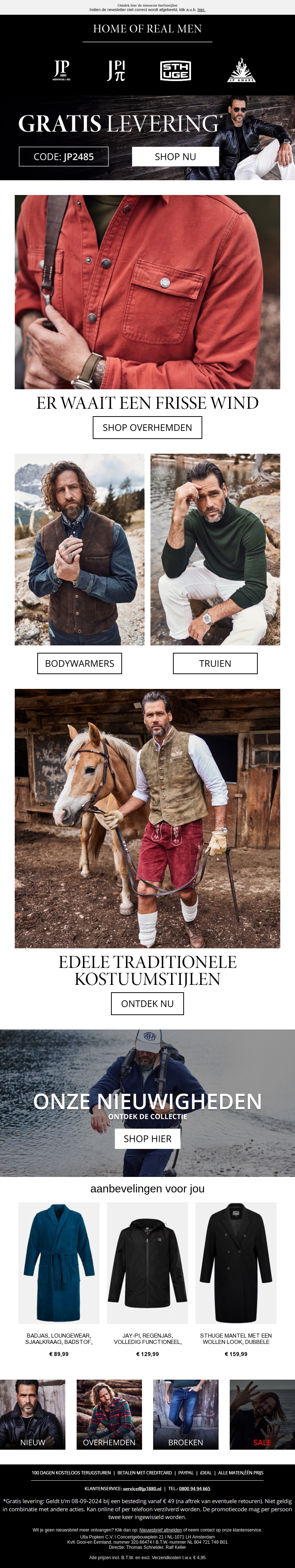 Maak kennis met de nieuwste items uit ons assortiment en profiteer vandaag van gratis verzendkosten! Van stijlvolle bodywarmers en truien tot traditionele kostuumstijlen, ontdek de laatste trends en voeg iets speciaals toe aan je garderobe. Mis ook onze exclusieve deals niet!