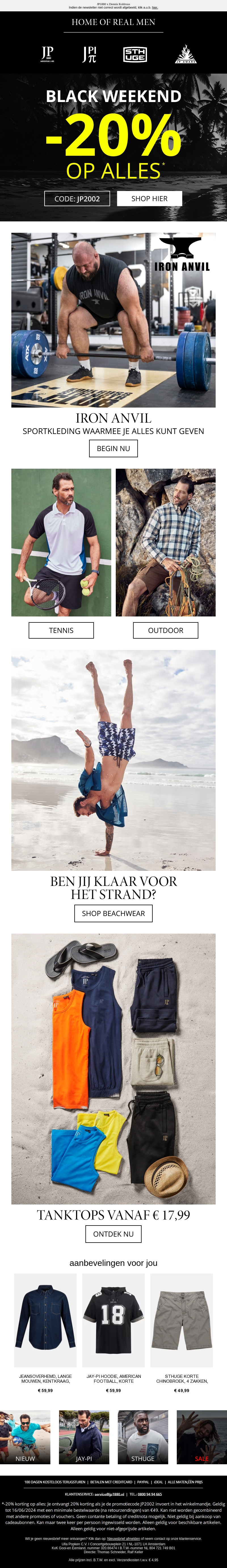 Vandaag knalt het bij Iron Anvil met 20% korting op alle stijlen. Gebruik de kortingscode JP2002 om te profiteren van deze geweldige aanbieding. Bekijk onze sportkleding voor tennis en outdoor, of shop de nieuwste strandmode. Tanktops vanaf €17,99 en nog veel meer.