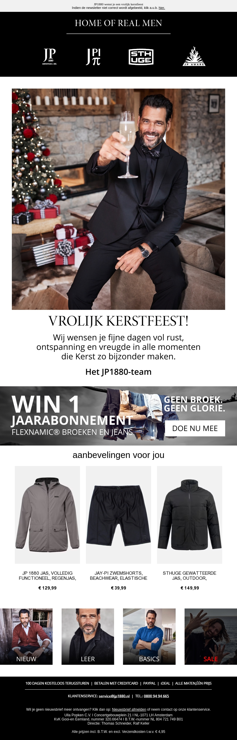 JP1880 wenst je een vrolijk kerstfeest en biedt stijlvolle kleding aan voor de feestdagen. Ervaar comfort en mode met onze speciale aanbieding en maak kans op een jaarabonnement op onze Flexnamic® broeken en jeans. Ontdek de nieuwste collecties en exclusieve deals voor deze kerst.