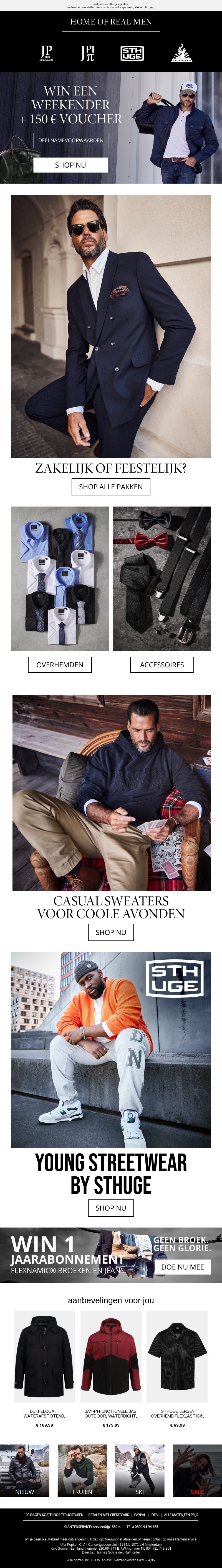 Deze nieuwsbrief presenteert elegante herenkleding. Ontdek zakelijke pakken en casual truien. Neem deel aan onze wedstrijd en win een stijlvolle weekendtas en een waardebon van €150. Mis deze kans niet om je garderobe te verfrissen!