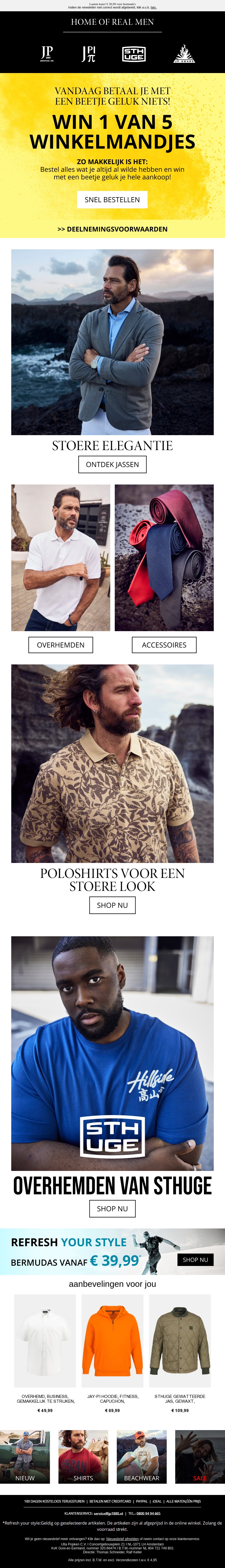 Vandaag betaal je met een beetje geluk niets! Doe mee aan onze winactie en maak kans om jouw winkelmandje gratis te winnen. Bestel nu uit onze uitgebreide collectie herenkleding, van stoere jassen tot stijlvolle overhemden en accessoires. Mis deze kans niet!